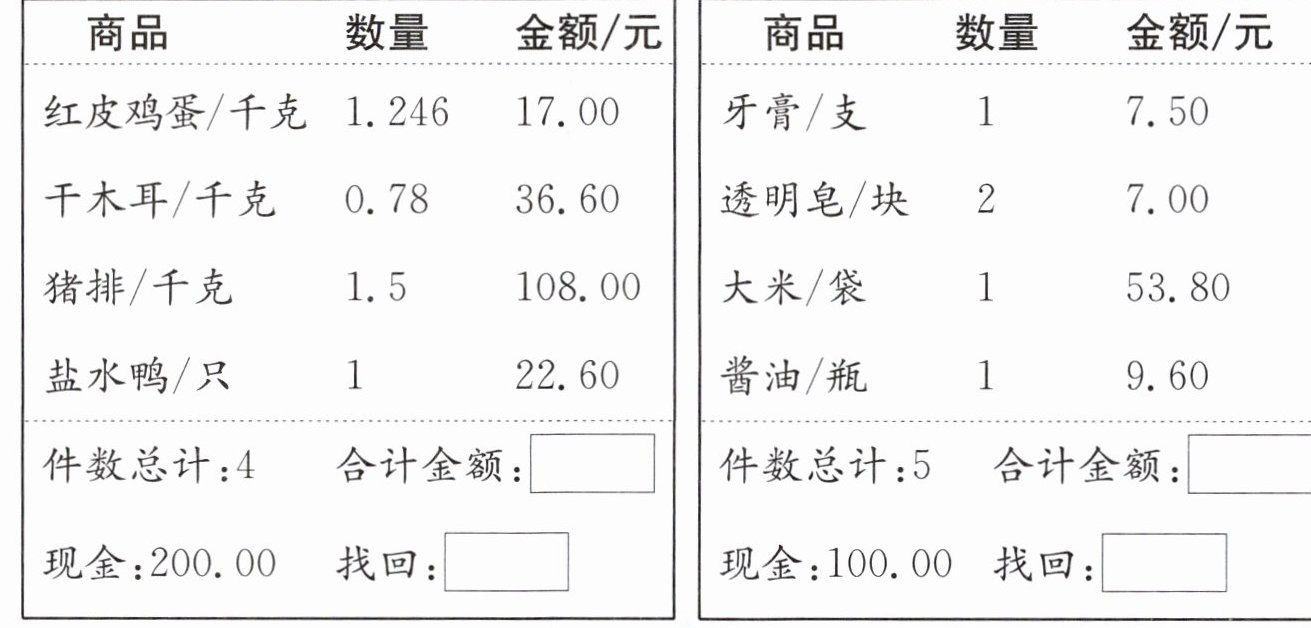 左边小票合计金额$=$红皮鸡蛋金额$+$干木耳金额$+$猪排金额$+$盐水鸭金额。