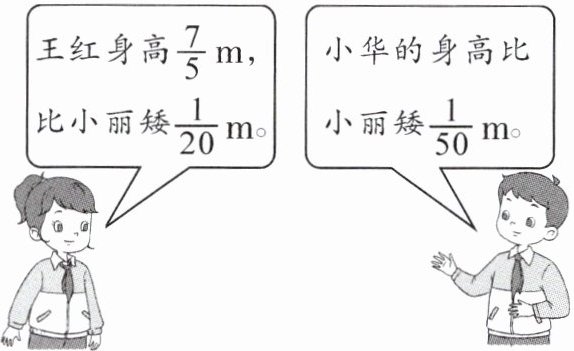 因为小华比小丽矮$\frac{1}{50}m$,所以小华的身高是$\frac{29}{20}-\frac{1}{50}=\frac{145}{100}-\frac{2}{100}=\frac{143}{100}(m)$,王红身高$\frac{7}{5}=\frac{140}{100}(m)$。