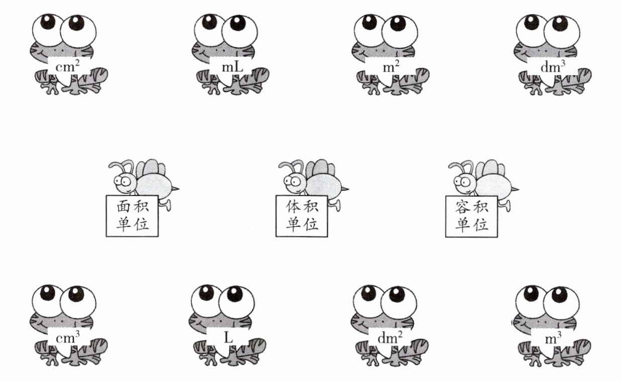 【解析】:根据面积单位、体积单位、容积单位的定义进行连线。面积单位是用来衡量平面图形大小的,$cm^{2}$(平方厘米)、$m^{2}$(平方米)、$dm^{2}$(平方分米)是面积单位;体积单位是用来衡量物体所占空间大小的,$dm^{3}$(立方分米)、$cm^{3}$(立方厘米)、$m^{3}$(立方米)是体积单位;容积单位是用来衡量容器所能容纳物体体积的,$mL$(毫升)、$L$(升)是容积单位。