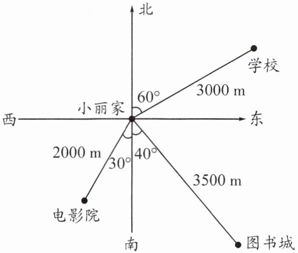 一、以小丽家为观测点,说说学校、电影院、图书城的位置。