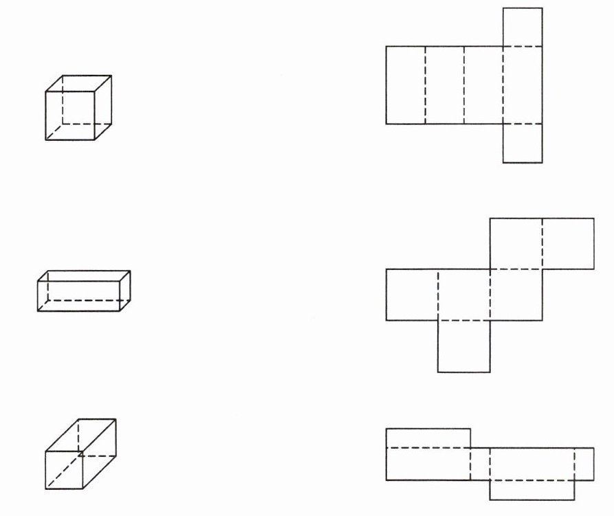 【答案】:第一个正方体连第二行右边展开图;第二个长方体(特殊)连第三行右边展开图;第三个长方体连第一行右边展开图。