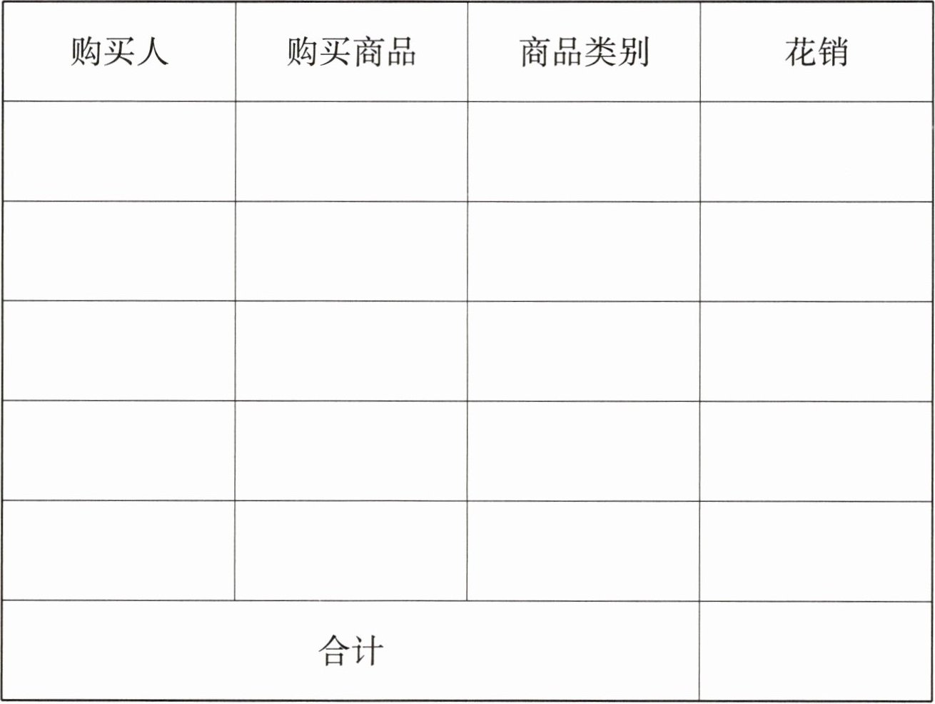 二、自制一份账单,记录一下你家一天购买了哪些商品,这些商品分别属于哪些类别,花了多少钱。