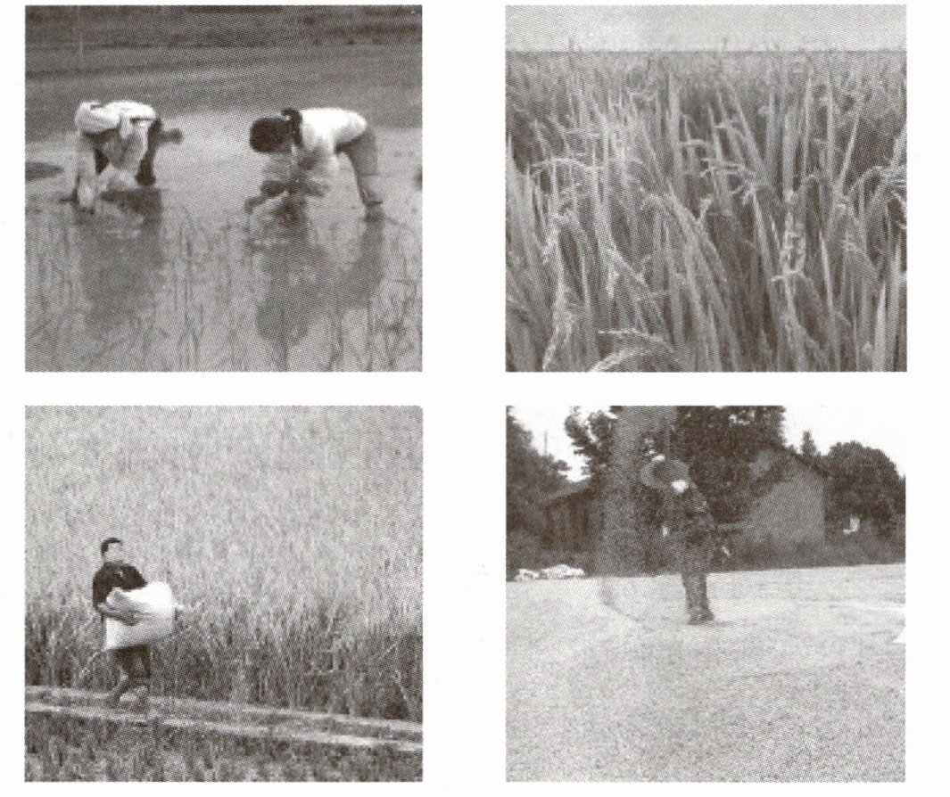 从图中可以看到粮食从耕地、插秧、生长、收割到晾晒等一系列过程,每一个环节都凝聚着农民的辛勤汗水。粮食的生产过程漫长且艰辛,需要付出大量的劳动和时间。所以我们要珍惜粮食,尊重农民的劳动成果。