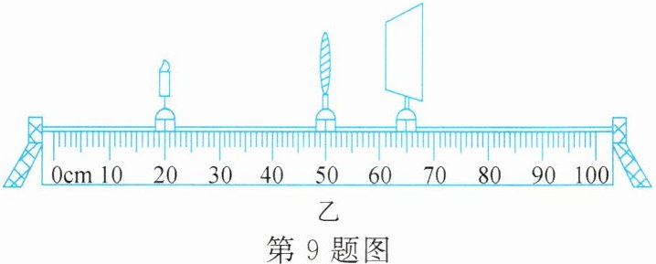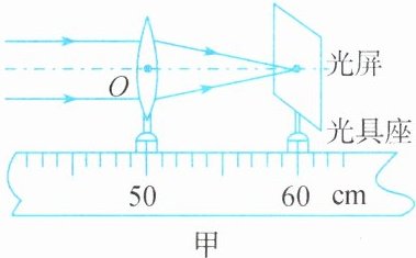 9. 在做“探究凸透镜成像的规律”的实验中,平行于主光轴的光线经凸透镜后会聚在光屏上一点,如图甲所示。