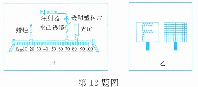 (3)小科测出此凸透镜的焦距为$ f = 10cm $,在研究凸透镜成像的规律时,有一组实验是将蜡烛、水凸透镜和光屏固定在如图甲所示的位置,此时成