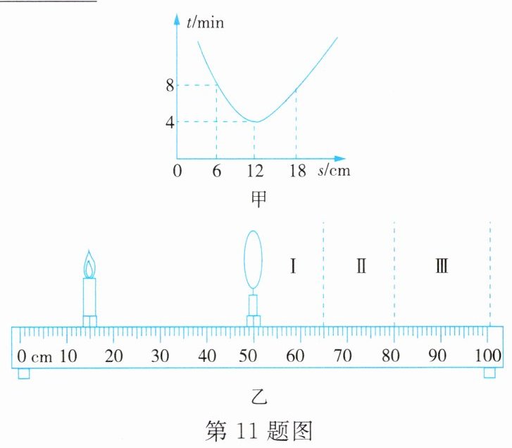 (1)利用太阳光,可测出凸透镜与白纸的间距$ s 与对应的白纸被烤焦的时间 t $,绘出如图甲所示的图像,可判断该凸透镜的焦距$ f $为