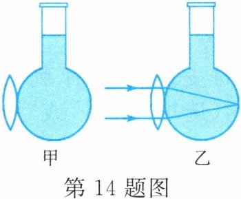 14.[科学探究]小科为探究近视眼的成因,找来一个圆底烧瓶当作眼球的玻璃体,里面装入牛奶和水的混合物(如图甲所示),在烧瓶前放一个凸透镜,用两激光灯模拟物体发射出的光线,实验时: