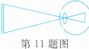 11. 隐形眼镜是一种直接贴在眼角膜表面的超薄镜片,可随眼球的运动而运动。目前传统的软性隐形眼镜由甲基丙烯酸羟乙酯(HEMA)制成,中心厚度只有0.05mm。如图所示是某人观察物体时,物体在眼球内成像的示意图,则该人所患眼病及应配戴的这种隐形眼镜镜片边缘的厚度分别为 (