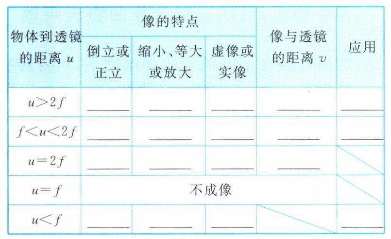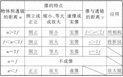 33. 倒立;缩小;实像;f<v<2f;照相机;倒立;放大;实像;v>2f;投影仪;倒立;等大;实像;v=2f;正立;放大;虚像;放大镜