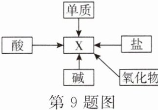 9. 小科学习了物质的性质后,梳理单质、氧化物、酸、碱、盐与X之间的转化关系如图所示。“→”表示某一种物质经一步反应可转化为另一种物质,部分反应物、生成物及反应条件已略去。