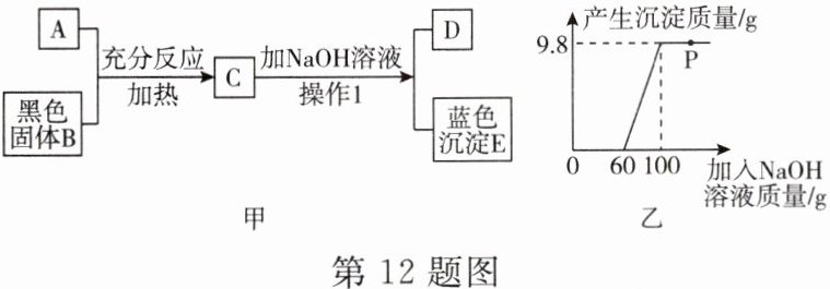 12. 图甲中A是一种常见的酸,它能与黑色固体B反应,B质量为8g,将$NaOH$溶液逐渐加入到C中,生成的蓝色沉淀E与加入$NaOH$溶液的质量关系如图乙所示,在D中加入$Ba(NO_{3})_{2}$溶液能生成一种不溶于稀硝酸的白色沉淀。