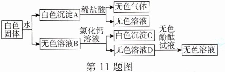 11. 有一包白色固体,可能由$BaCl_{2}$、$NaOH$、$Na_{2}CO_{3}$、$Na_{2}SO_{4}$中的一种或几种组成。为确定其成分,实验小组进行实验。实验过程中所加试剂均足量,实验过程及现象如图所示。