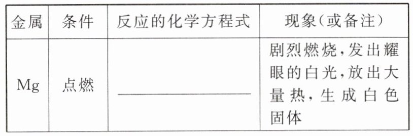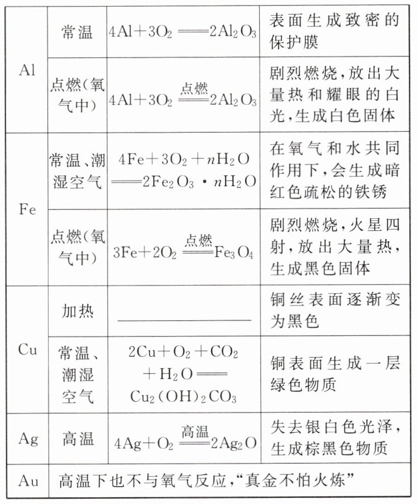 大多数金属都能与氧气反应,但难易和剧烈程度不同。Mg、Al等在常温下就能与氧气反应;Fe、Cu等在常温下几乎不能单独与氧气反应,点燃或加热情况下可以发生反应;Au在高温时也不与氧气反应。