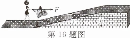 16. 如图所示,一顾客用一水平恒力F将购物车从粗糙斜坡的底端匀速推上顶端,斜坡长s,高h,购物车(含车上物品)重为G,在这个过程中,水平推力做的功为 (