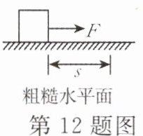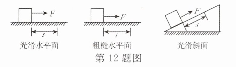 12. 同一物体在相同大小的力F作用下沿力F的方向移动了相同的距离s,试比较在图示的三种情况中力F对物体做功的大小($W_{1}$、$W_{2}$、$W_{3}$分别表示力F在光滑水平面、粗糙水平面、光滑斜面对物体做的功) (
