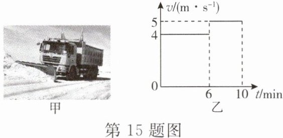 15. 如图甲所示是一辆除雪车正在水平路面上除雪的场景,该车10min内的运动图像如图乙所示。若该除雪车的总质量为6t,除雪过程中所受水平阻力为$6×10^{3}N$,车轮与地面的总接触面积为0.4m^2,$g$取10N/kg,求该除雪车: