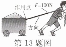 13. 如图所示,小强用100N的力斜向上拉着总重为500N的小车,使小车在水平路面上匀速前进了10m,用了10s。下列说法中正确的是 (