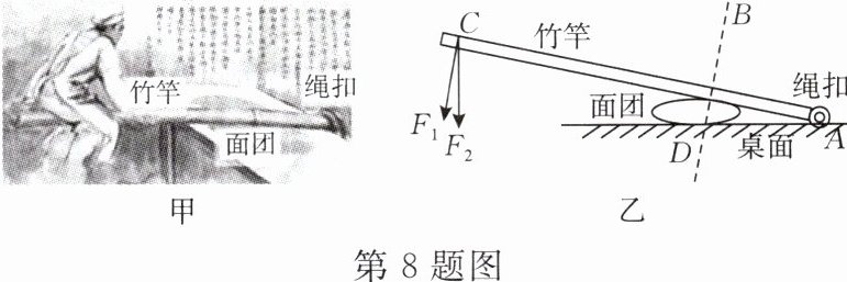 8. 如图甲所示是传统美食“竹升面”的制作过程,原理如图乙所示,让竹竿A端固定在绳扣中,人坐在竹竿上的C端上下跳动,带动竹竿挤压面团增加韧性。此过程中竹竿属于