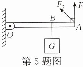 5. 如图所示,杠杆OBA可绕O点在竖直平面内转动,OB= 2BA,在B点悬挂一个10N的重物G,在A点施加竖直向上的动力F,使杠杆OBA水平平衡(杠杆重力及摩擦均忽略不计),下列说法正确的是 (