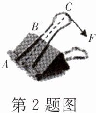 2. 燕尾夹是常用的文具,它利用了杠杆原理。燕尾夹可简化为杠杆ABC(如图所示),其中AB= BC,当用力F以图示方式按住C点打开该夹子时,假设作用力垂直于燕尾所在平面,下列说法正确的是 (