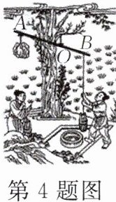 4. 春秋时期,古人利用杠杆原理制作桔槔从井中汲水(如图所示):用细绳系住一轻质直硬棒的O点作为支点,A端系着一块石头,B端系着一只空桶,OA>OB。使用时,先拉着B端绳子将桶送入井中,待桶中灌水后拉绳上升。下列说法中正确的是 (