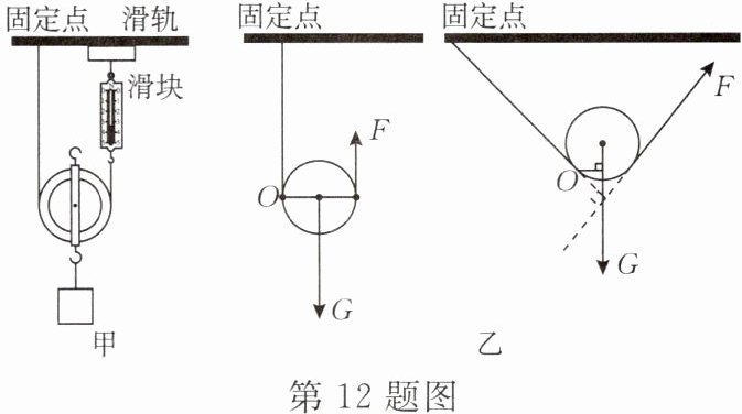 12. 小明思考:“使用动滑轮时,若拉力的方向没有保持竖直向上,是否还能省一半的力”,于是设计了由滑轮、滑轨、滑块、弹簧测力计等组成的实验装置(如图甲所示),通过移动滑块来改变拉力与竖直方向的夹角θ,进行实验。其中绳重和摩擦忽略不计,获得实验数据如表所示: