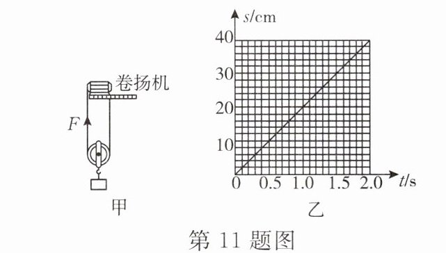 11. 如图甲所示,用一个动滑轮匀速提升重为600N的物体,在卷扬机拉力F的作用下,绳子自由端竖直移动的距离随时间变化的关系如图乙所示。已知动滑轮受到的重力为20N,不计绳重和轮与轴间的摩擦。下列说法正确的是(