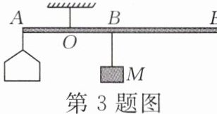 3. 如图所示,小明用一轻质杠杆自制简易密度秤的过程中,在A端的空桶内分别注入密度已知的不同液体,改变物体M悬挂点B的位置,当杠杆在水平位置平衡时,在M悬挂点处标出相应液体的密度值,下列关于密度秤制作的说法中,正确的是(