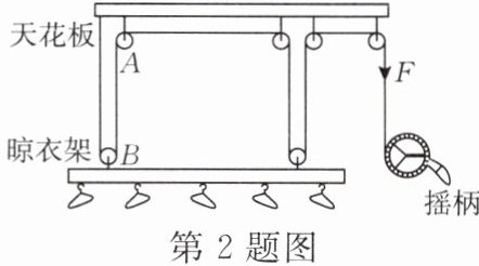 2. 如图所示是小金家阳台上的手摇晾衣架,衣服和晾衣架的总重为100N,在拉力作用下5s内使衣服匀速上移了1m,不计滑轮重、绳重及摩擦。下列说法正确的是(