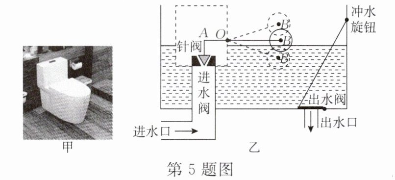 5. 如图甲所示是一个家用的抽水马桶,每次按压冲水旋钮出水后,水箱会自动流进一定量的水,水位上升到一定高度后,可以自动停止进水。项目化小组通过查阅资料学习了它的工作原理后,计划制作一个模型,具体设计如图乙所示:当水箱中的水位较低时,进水口进水,浮球随水箱水面上浮,达到设定水位后,金属杆AOB(O为支点)带动针阀下降堵住进水口,从而稳定水箱水位。O点还可以调节松紧,以方便在不同角度固定金属杆OB。