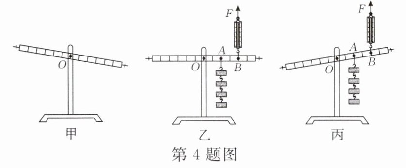 N。(4)在实验操作过程中,小明同学拉动杠杆从水平位置慢慢转过一定角度,如图丙所示。此过程中,竖直的弹簧测力计拉力大小