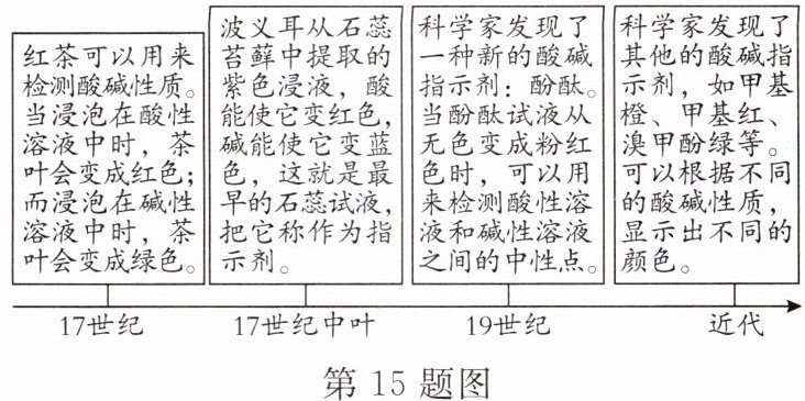 15. [科学探究]酸碱指示剂是一种化学试剂,可以用来检测溶液的酸碱性质。如图展示了它的发现及发展历史。请结合图示信息及相关知识回答下列问题。