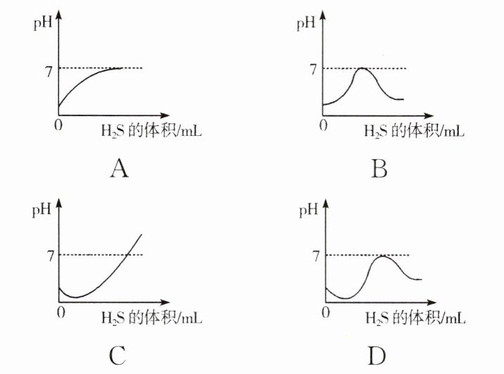 14. 二氧化硫气体是造成酸雨的主要气体,其水溶液叫亚硫酸$(H_2SO_3);$硫化氢$(H_2S)$是一种具有臭鸡蛋气味的剧毒气体,其水溶液叫氢硫酸。已知在相同的条件下,氢硫酸的酸性弱于亚硫酸。在室温下向饱和的亚硫酸溶液中通入过量的硫化氢气体,发生反应的化学方程式为$2H_2S + H_2SO_3 = 3S↓ + 3H_2O。$则溶液的pH随通入硫化氢体积变化的曲线示意图是(