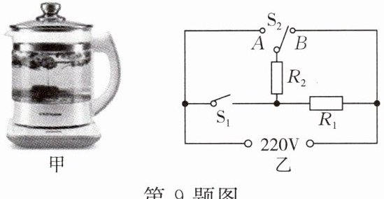 9. 如图甲所示的多功能养生壶具有精细烹饪、营养量化等功能,深受市场认可和欢迎。如图乙所示是某品牌养生壶简化电路图,该养生壶铭牌上的部分参数如表所示。$[ρ_{水}= 1×10^{3}kg/m^{3},c_{水}= 4.2×10^{3}J/(kg\cdot ^{\circ}C),g= 10N/kg]$。