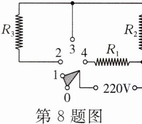 8. 火锅是人们比较喜欢的一种饮食方式,如图所示为小柯家使用的一款电火锅工作电路原理图,它有高、中、低三个加热挡位,旋钮开关可以分别置于“$0和1$”“$1和2$”“$2和3$”或“$3和4$”接线柱。正常工作时,低温挡功率为高温挡功率的$\frac{1}{5}$,$R_{1}的阻值为242Ω$,$R_{2}的阻值为60.5Ω$(忽略温度对电阻的影响)。