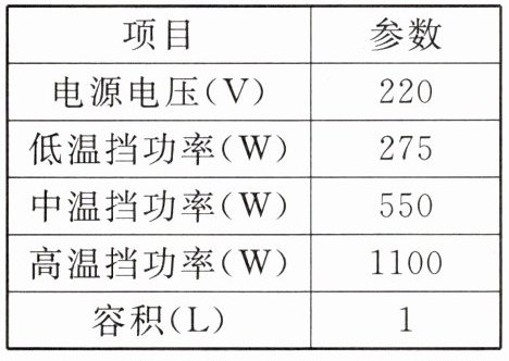 (4)水的质量$m=\rho V=1×10^3kg/m^3×1×10^{-3}m^3=1kg$,水吸收的热量$Q_{吸}=cm(t-t_0)=4.2×10^3J/(kg\cdot^{\circ}C)×1kg×(100^{\circ}C-12^{\circ}C)=3.696×10^5J$。由$\eta=\frac{Q_{吸}}{W}$,$W=Pt$得,烧开一壶水需要的时间为$t=\frac{Q_{吸}}{P_{高}×\eta}=\frac{3.696×10^5J}{1100W×80\%}=420s=7min$。