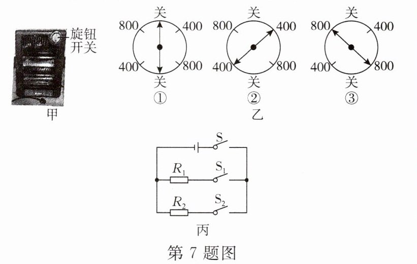 7. 图甲是一款家用电热器,旋钮开关位置如图乙所示有三种:关闭、低温挡($400W$)和高温挡($800W$)。电热器内部有两根电热丝$R_{1}和R_{2}$,小明绘制了简易原理图如图丙所示。