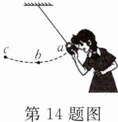 14. 用绳子把一个铁锁悬挂起来。把铁锁拉到刚好贴着自己鼻子的位置,如图所示,稳定后松手,自身保持不动,铁锁由开始位置a沿弧线ac向另一侧的最高点c运动,然后再从c往回运动。