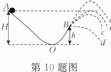 10. 如图所示,A点的高度H大于B点的高度h,让小球从A点由静止开始自由落下,沿光滑轨道AOB到达B点后离开(不计空气阻力),则小球由A点运动到O点的过程中,小球的重力势能