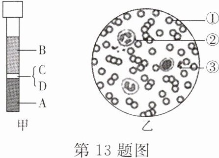 13. 如图所示,甲是血液分层图,乙为显微镜下看到的人血涂片图像,请据图分析回答下列问题:
