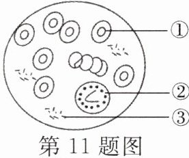 11. 小科观看了《了解显微镜的结构及操作步骤》科学视频后,在学校的科学实验室内动手观察人血涂片,如图所示。下列分析正确的是 (