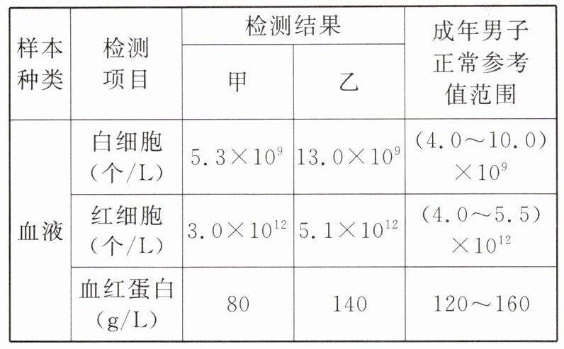 (1)医生依据甲血检中红细胞和血红蛋白的数值都偏低,判断他可能患有