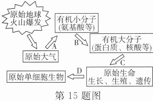 15. 如图所示是地球生命起源过程的示意图,请据图回答下列有关生命起源的问题。