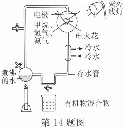 14. 历史上巨行星(如木星和土星)的大气成分变化可能较小,而现在它们的大气中都没有游离氧,其主要成分是氢气、氦气、甲烷和氨气等。由此推断,原始地球的大气成分和木星、土星上的大气成分类似。1953年米勒做了一个探索地球上的生命是如何起源的实验。米勒向装置中通入推测的地球原始大气成分:甲烷、氢气、氨气、水蒸气,通过放电和紫外线照射的方法模拟原始地球的环境条件,获得了多种氨基酸。请据图回答下列问题。