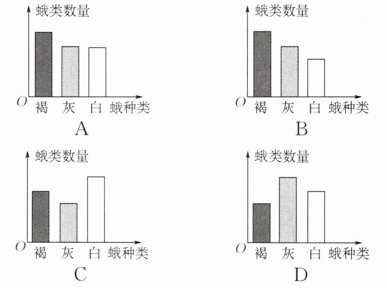 的作用。(3)由于真菌感染而使某片森林中所有树干的颜色都变成了灰白色,多年以后,此森林中不同颜色的蛾类数量最可能出现的变化结果是下列四幅图中的