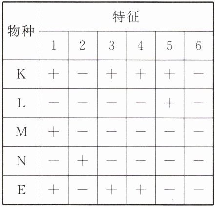 11. 有五种生物(K、L、M、N、E),它们属于同一科同一属,如表所示是它们在六个显著特征上的表现(“+”表示该物种具有该特征,“-”表示该物种不具有该特征)。根据进化理论,物种最可能的进化路径是特征改变数量最少的那一条。如果是这样的话,物种E最可能的祖先是 (