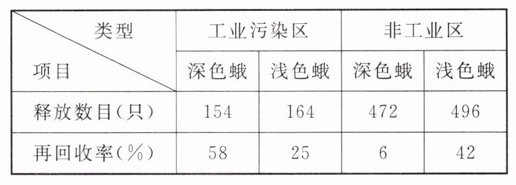 13. 科学家做过如下实验,将深色桦尺蛾和浅色桦尺蛾分别进行标记,然后放养于不同的地点,一段时间后,将所释放的桦尺蛾尽量收回,统计数目,结果如表所示: