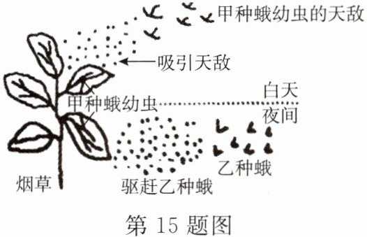 15. 如图所示,当烟草叶片受到甲种蛾幼虫的采食刺激后,会释放出挥发性化学物质。这种化学物质白天会吸引甲种蛾幼虫的天敌,夜间会驱赶乙种蛾,使其不能在烟草叶片上产卵(乙种蛾幼虫也采食烟草叶片)。据此回答下列问题: