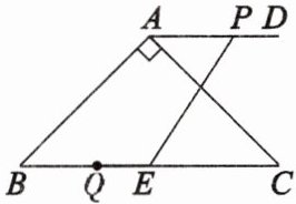 如图,在$\triangle ABC$中,$\angle BAC = 90^{\circ}$,$\angle B = 45^{\circ}$,$BC = 10$,过点$A作AD// BC$,且点$D在点A$的右侧。点$P从点A出发沿射线AD方向以每秒1$个单位的速度运动,同时点$Q从点C出发沿射线CB方向以每秒2$个单位的速度运动,在线段$QC上取点E$,使得$QE = 2$,连结$PE$,设点$P的运动时间为t$秒。