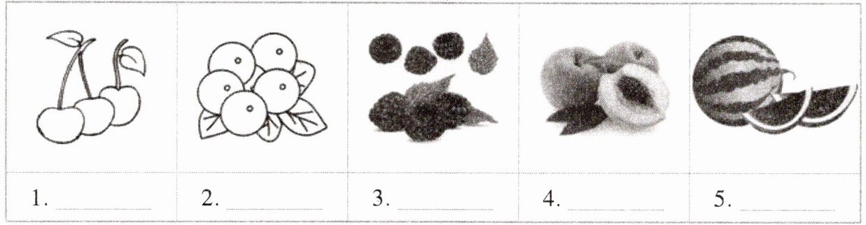 1. cherry 2. blueberry 3. raspberry 4. peach 5. watermelon
